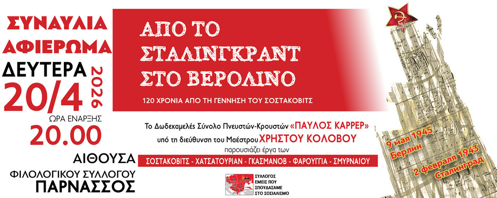 Με αφορμή τα παραπάνω, ο Σύλλογος «Εμείς που σπουδάσαμε στο Σοσιαλισμό» διοργανώνει συναυλία - αφιέρωμα με έργα συμφωνικής μουσικής, εμβατήρια και soundtracks.