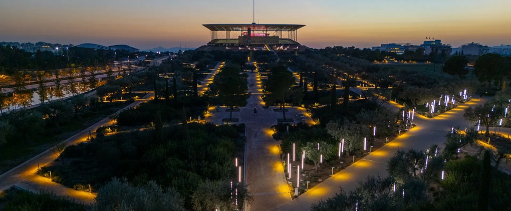 The experience is complemented by a field of more than one hundred LED light columns, welcoming visitors as they enter the Stavros Niarchos Park through the diagonal path leading to the Great Lawn - an impressive installation by Eleni Maragaki and Giorgos Nikas, previously presented at the SNFCC in 2022 and 2024.