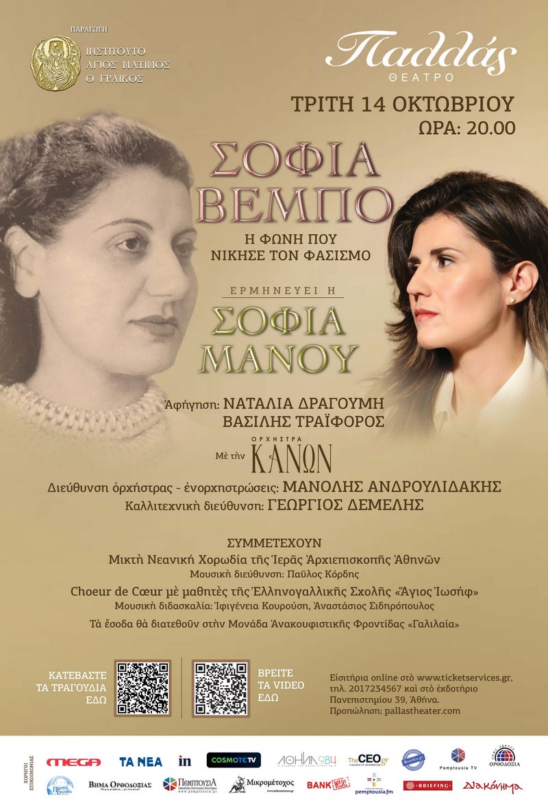 Η παράσταση «Σοφία Βέμπο - Η φωνή που νίκησε τον φασισμό», με αφορμή τον ομώνυμο δίσκο που κυκλοφόρησε το 2020 με τη Σοφία Μάνου, από το Ινστιτούτο Άγιος Μάξιμος ο Γραικός, θα παρουσιαστεί την Τρίτη 14 Οκτωβρίου, στις 20:00, στο θέατρο Παλλάς, ξυπνώντας μνήμες από το έπος του '40 και φέρνοντας στο φως την αιώνια δύναμη της τέχνης απέναντι στο σκοτάδι.
