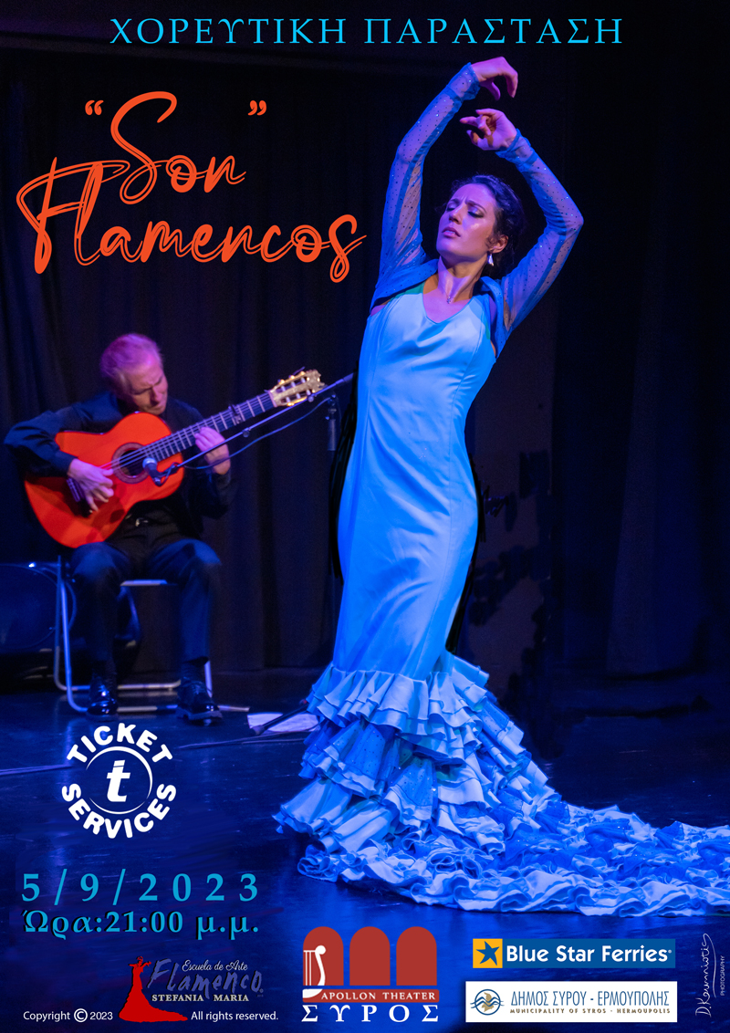 Την Τρίτη 5 Σεπτεμβρίου η χορεύτρια και χορογράφος Στεφανία Μαρία Σιδέρη θα παρουσιάσει για πρώτη φορά στο ελληνικό κοινό την νέα της παράσταση "SON" FLAMENCOS, στο θέατρο Απόλλων της Σύρου, πλαισιωμένη από τους ταλαντούχους μουσικούς της που χαίρουν διεθνούς αναγνώρισης. Μια αυθεντική παράσταση φλαμένκο που θα σας ταξιδέψει στα μουσικά σοκάκια της Ανδαλουσίας.