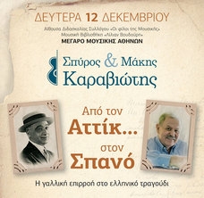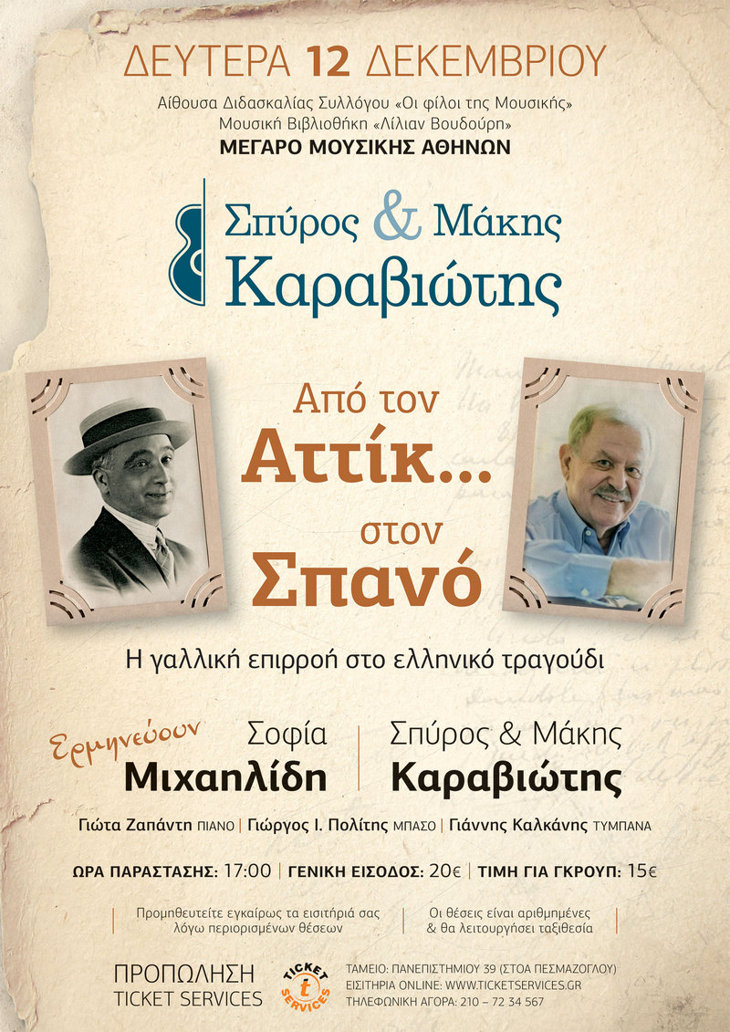 Τη Δευτέρα 12 Δεκεμβρίου 2022, ώρες 17:00 & 20:00 στην Αίθουσα Διδασκαλίας της Μουσικής Βιβλιοθήκης «Λίλιαν Βουδούρη» στο Μέγαρο Μουσικής Αθηνών (Βασιλίσσης Σοφίας & Κόκκαλη), οι τραγουδιστές Σπύρος & Μάκης Καραβιώτης συμπράττουν με την ερμηνεύτρια Σοφία Μιχαηλίδη παρουσιάζοντας μια πρωτότυπη συναυλία με τίτλο: