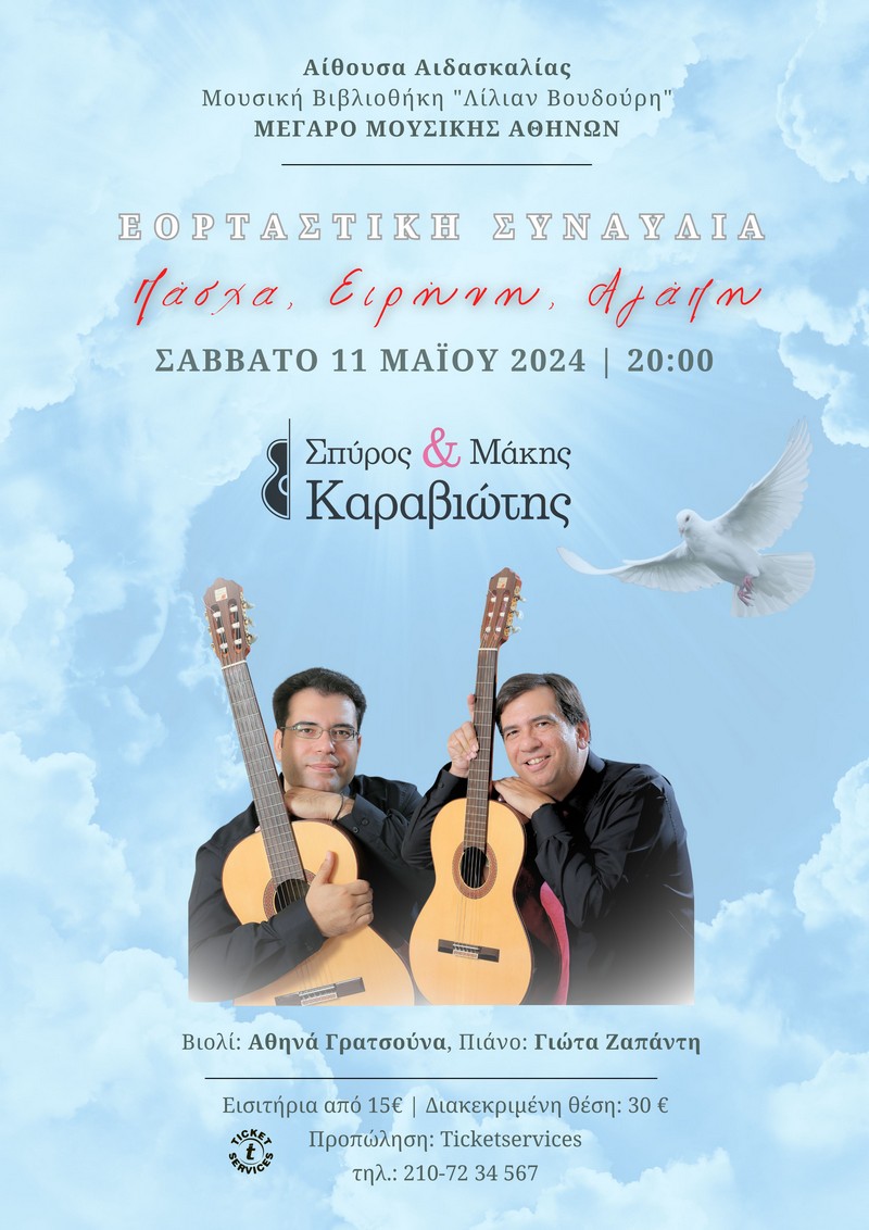 Οι σύγχρονοι τροβαδούροι αδελφοί Σπύρος & Μάκης Καραβιώτης γνωστοί μέσα από εμφανίσεις τους σε επίλεκτες πολιτιστικές εκπομπές της ελληνικής τηλεόρασης και του ραδιοφώνου (Το Αλάτι της Γης, Στάση ΕΡΤ, Έχει Γούστο, Η Φωνή της Ελλάδος) σας προσκαλούν σε ένα εορταστικό μουσικό ταξίδι, αφιερωμένο σε τραγούδια που εκφράζουν στις ιδέες του Πάσχα που είναι η Ειρήνη & η Αγάπη.