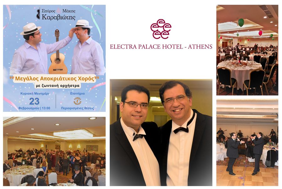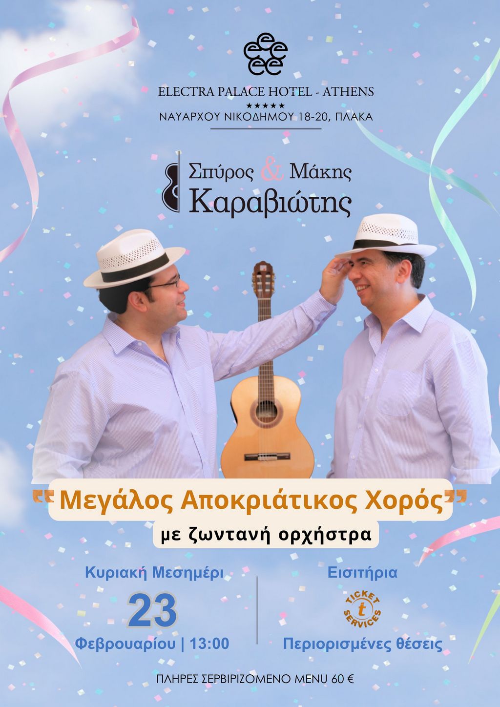 Οι δημοφιλείς τροβαδούροι, αδελφοί Σπύρος & Μάκης Καραβιώτης, σας προσκαλούν, την Κυριακή των Απόκρεων 23 Φεβρουαρίου 2025 & ώρα 13:00 το μεσημέρι, σε μια πολύ ξεχωριστή αποκριάτικη εκδήλωση στο Ballroom του πολυτελούς ξενοδοχείου Electra Palace ***** (Ναυάρχου Νικοδήμου 18 - 20, Πλάκα) με τίτλο: