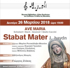 Το εκφραστικότατο έργο, ύμνο στην Παρθένο Μαρία, "STABAT MATER", με δεκατρία μέρη, για σολίστ, χορωδία και πιάνο, του Josef Haydn [Rohrau 1732- Vienna 1809], θα ερμηνεύσει, σε διδασκαλία Γεωργίου Ζιάκα, η μικτή χορωδία "Μελωδοί", την Δευτέρα 26 Μαρτίου 2018, στη Μουσική Βιβλιοθήκη "Λίλιαν Βουδούρη", στο Μέγαρο Μουσικής Αθηνών.