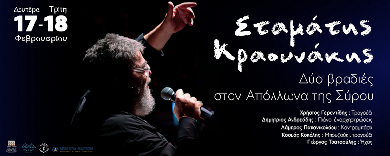 Ο Σταμάτης Κραουνάκης με τρεις εκλεκτούς μουσικούς συνεργάτες του και τον ερμηνευτή του Χρήστο Γεροντίδη θα τραγουδήσουν όσα περισσότερα τραγούδια μπορούν να χωρέσουν σε δύο βραδιές στον Απόλλωνα.