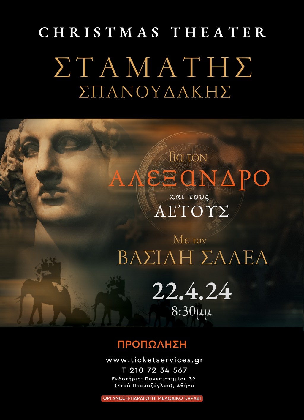 Για τον Αλέξανδρο και τους Αετούς της Αεροπορίας, λοιπόν, με τον αξεπέραστο Βασίλη Σαλέα, τον μαέστρο μας Ντίνο Γεωργούντζο και όλους τους αγαπημένους μου μουσικούς και συνεργάτες, στο Christmas Theater στις 22 Απριλίου, λίγες μόλις μέρες πριν από την εορτή των εορτών, το Πάσχα!