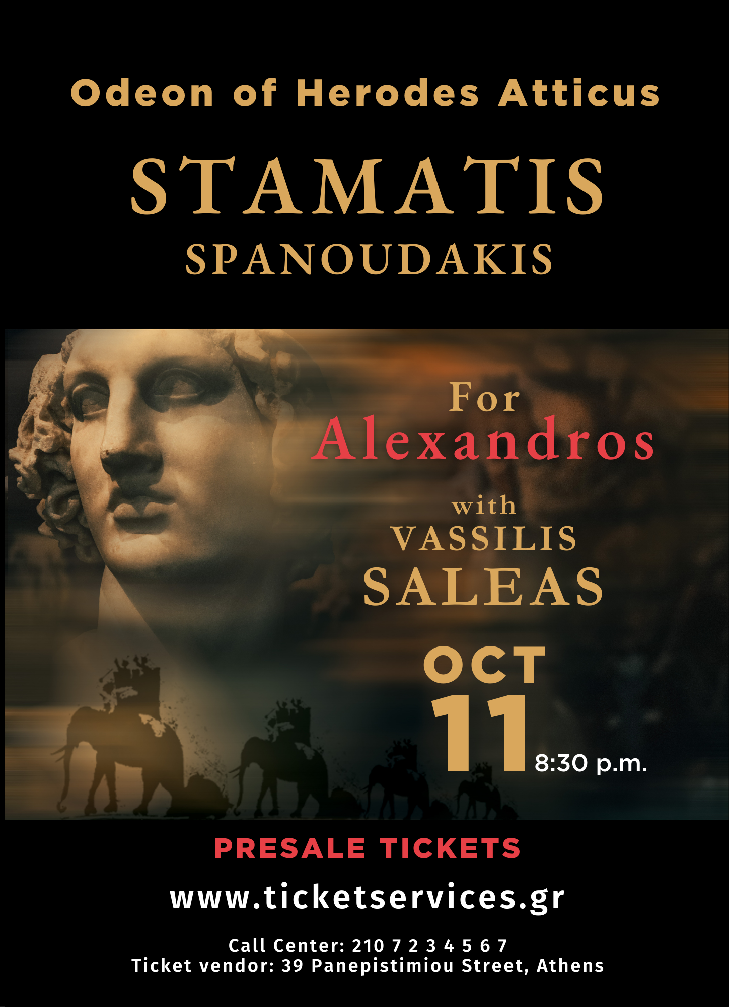 On Wednesday, October 11, 2023, at 8:30 p.m., Stamatis Spanoudakis will deliver a great concert dedicated to Alexander the Great at the Odeon of Herodes Atticus. 28 years later, the beloved composer reunites with the one and only Vassilis Saleas on stage!
