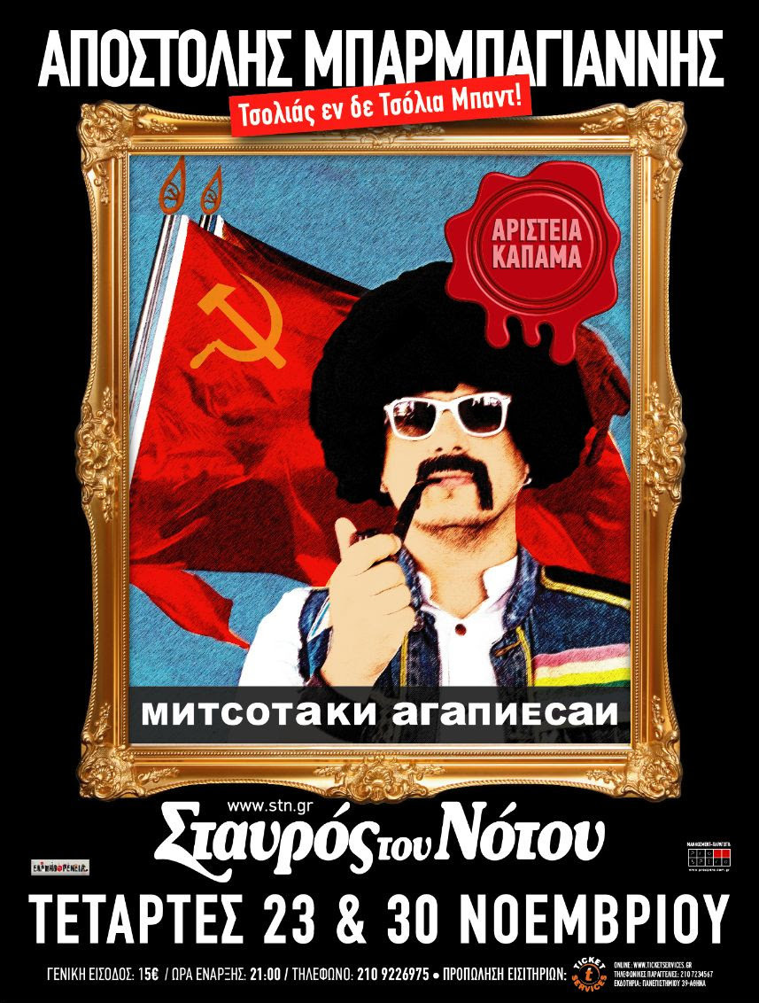 Ο Αποστόλης Μπαρμπαγιάννης ανεβαίνει στην Κεντρική σκηνή του Σταυρού του Νότου για δυο παραστάσεις προεκλογικού και σκανδαλοθηρικού περιεχομένου να σατιρίσει τα κακώς κείμενα και υποκείμενα, σε ένα Stand-Up Comedy Show με ζωντανή ορχήστρα.