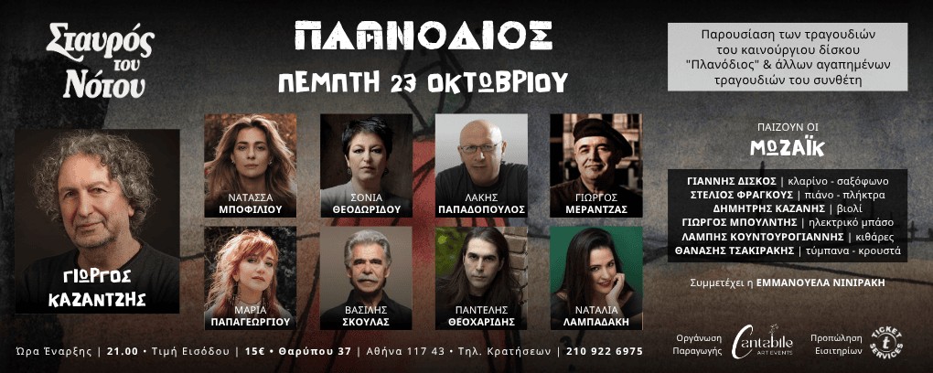 Μια μουσική βραδιά που τα τραγούδια του Πλανόδιου, σε στίχους του Ισαάκ Σούση, της Ναντίνας Κυριαζή και του Βαγγέλη Βελώνια, θα κάνουν την παρθενική τους επαφή ζωντανά με το κοινό που θα βρεθεί στο Σταυρό του Νότου για να ζήσει από κοντά μια ξεχωριστή εμπειρία, όπου κάθε ερμηνευτής γίνεται ο πρωταγωνιστής του ιδιαίτερου κλίματος του κάθε τραγουδιού.