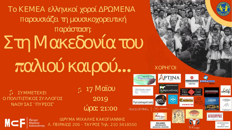 Το Κέντρο Μελετών, Έρευνας και Ανάπτυξης Ελληνικοί Χοροί «ΔΡΩΜΕΝΑ» παρουσιάζει τη μουσικοχορευτική παράσταση «Στη Μακεδονία του παλιού καιρού».