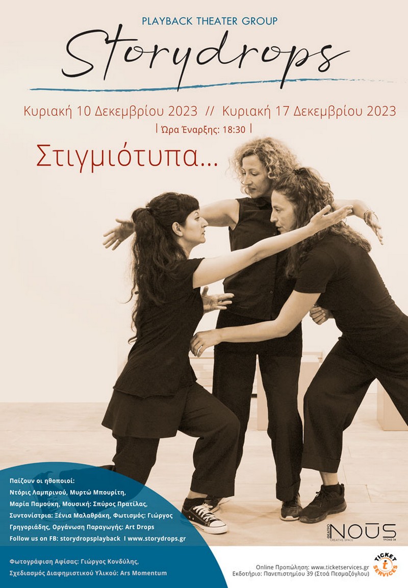 Η ομάδα θεάτρου playback "Storydrops" σας καλεί σε μια μοναδική παράσταση που φέρνει στο εδώ και τώρα στιγμιότυπα μιας δικής σας ιστορίας. Ηθοποιοί και μουσικός αυτοσχεδιάζουν επί σκηνής και δίνουν ζωή σε δικά σας όνειρα, βιώματα, στιγμές και επιθυμίες.