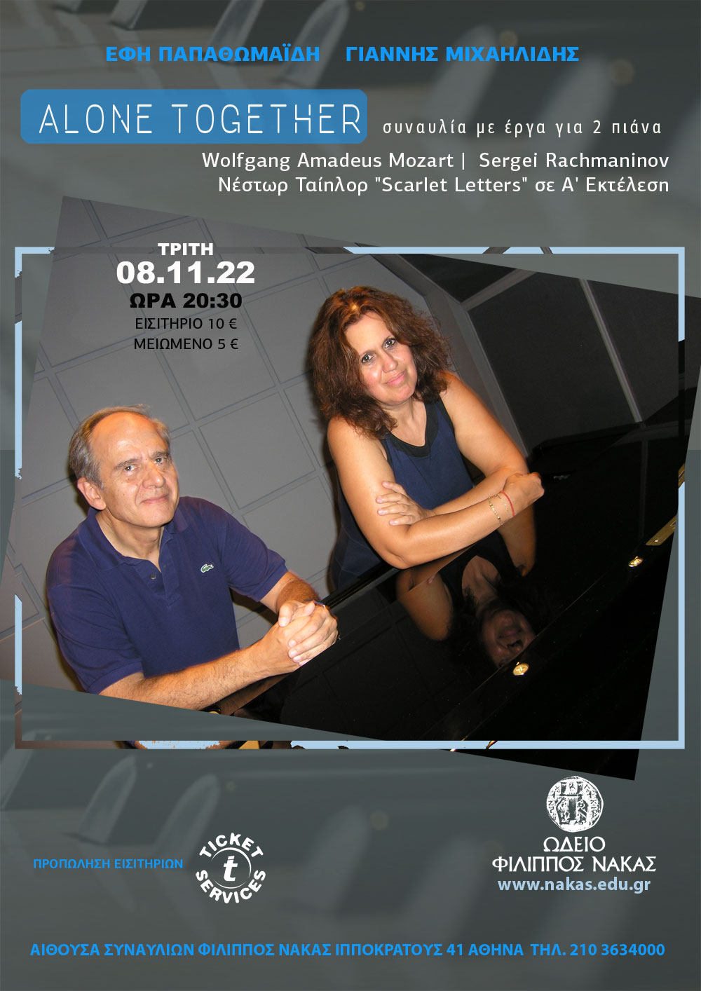 Η Έφη Παπαθωμαΐδη και ο Γιάννης Μιχαηλίδης, στην επέτειο των 27 χρόνων συνεργασίας τους, παρουσιάζουν ένα πρόγραμμα που περιλαμβάνει δύο κορυφαία έργα του ρεπερτορίου για 2 πιάνα: Την αριστουργηματική Σονάτα Κ. 448 σε ρε μείζονα του W.A. Mozart και την ονειρική Σουίτα αρ. 1 Fantaisie (Tableaux), Op. 5 του Rachmaninov, αλλά και ένα νέο έργο του Έλληνα συνθέτη Νέστορα Ταίηλορ.