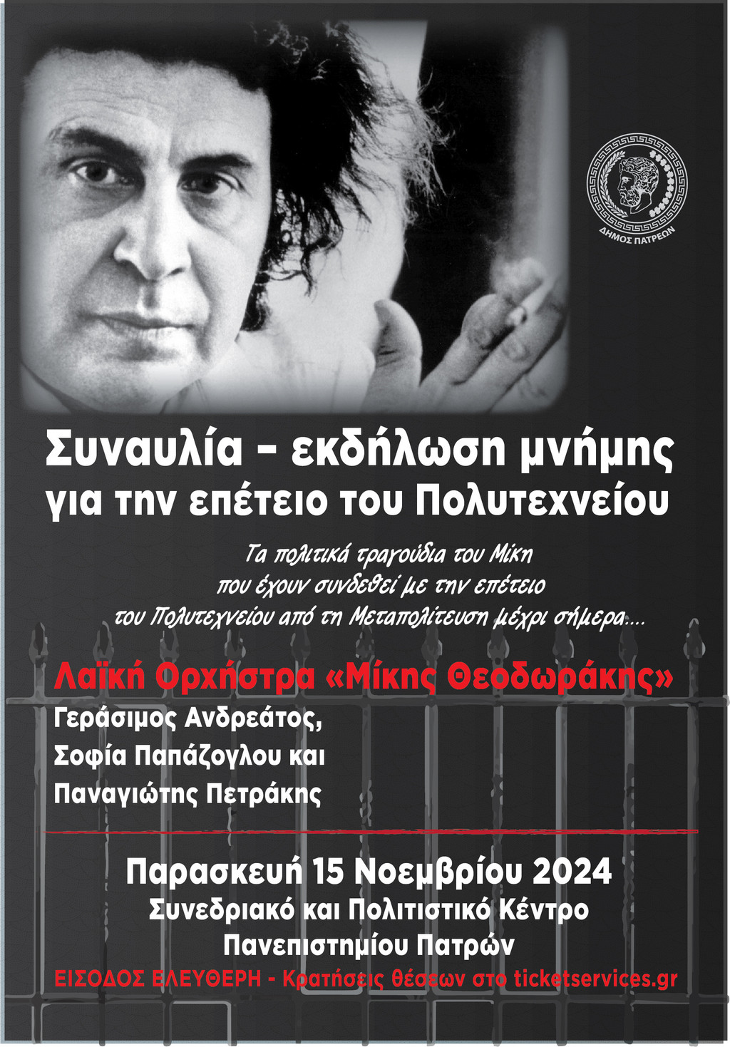 Στο πλαίσιο των εκδηλώσεων του ο Δήμος Πατρέων διοργανώνει μία συναυλία με τη Λαϊκή Ορχήστρα «Μίκης Θεοδωράκης».