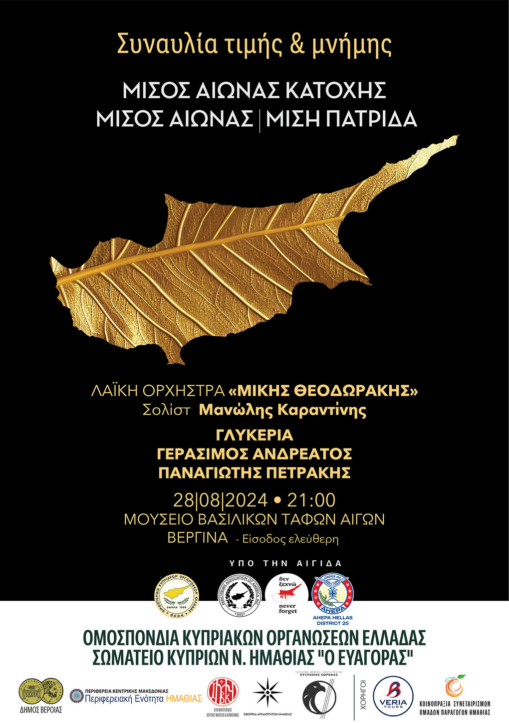 Στο πλαίσιο των εκδηλώσεων του 2024 για την επέτειο των 50 χρόνων τουρκικής κατοχής στην Κύπρο, η Ομοσπονδία Κυπριακών Οργανώσεων Ελλάδας (Ο.Κ.Ο.Ε.) και το Σωματείο Κυπρίων Ν. Ημαθίας «Ο Ευαγόρας» με αίσθημα ευθύνης απέναντι στην Ιστορία και σε αγαστή συνεργασία με τον Δήμο Βέροιας, την Περιφέρεια Κεντρικής Μακεδονίας - Περιφερειακή Ενότητα Ημαθίας, την Ιερά Μητρόπολη Βεροίας, Ναούσης και Καμπανίας, την Εφορεία Αρχαιοτήτων Ημαθίας, τον Παγκύπριο Σύνδεσμο Αμερικής, την PSEKA, την AHEPA HELLAS, την Κοινοπραξία Συνεταιρισμών Ομάδων Παραγωγών Ημαθίας και τον Πολιτιστικό Σύλλογο Πατρίδας «Ευστάθιος Χωραφάς», διοργανώνουν συναυλία την Τετάρτη 28 Αυγούστου, 9:00 μ.μ. στον αύλειο χώρο των Βασιλικών Τάφων των Αιγών στη Βεργίνα, με την Ανεξάρτητη Λαϊκή Ορχήστρα «Μίκης Θεοδωράκης» και με τη συμμετοχή των σπουδαίων Ελλήνων ερμηνευτών Γλυκερίας, Γεράσιμου Ανδρεάτου και Παναγιώτη Πετράκη.