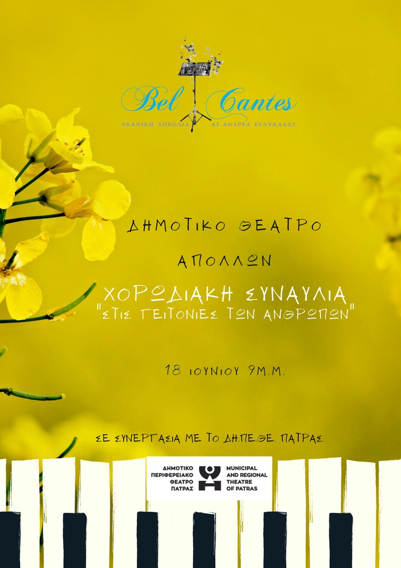 Στις 18 Ιουνίου και ώρα 9 μ.μ. θα πραγματοποιηθεί συναυλία όλων των τμημάτων της χορωδίας μας, BelCantes - BelCantini - Belles, στο Δημοτικό Θέατρο Απόλλων Πατρών.