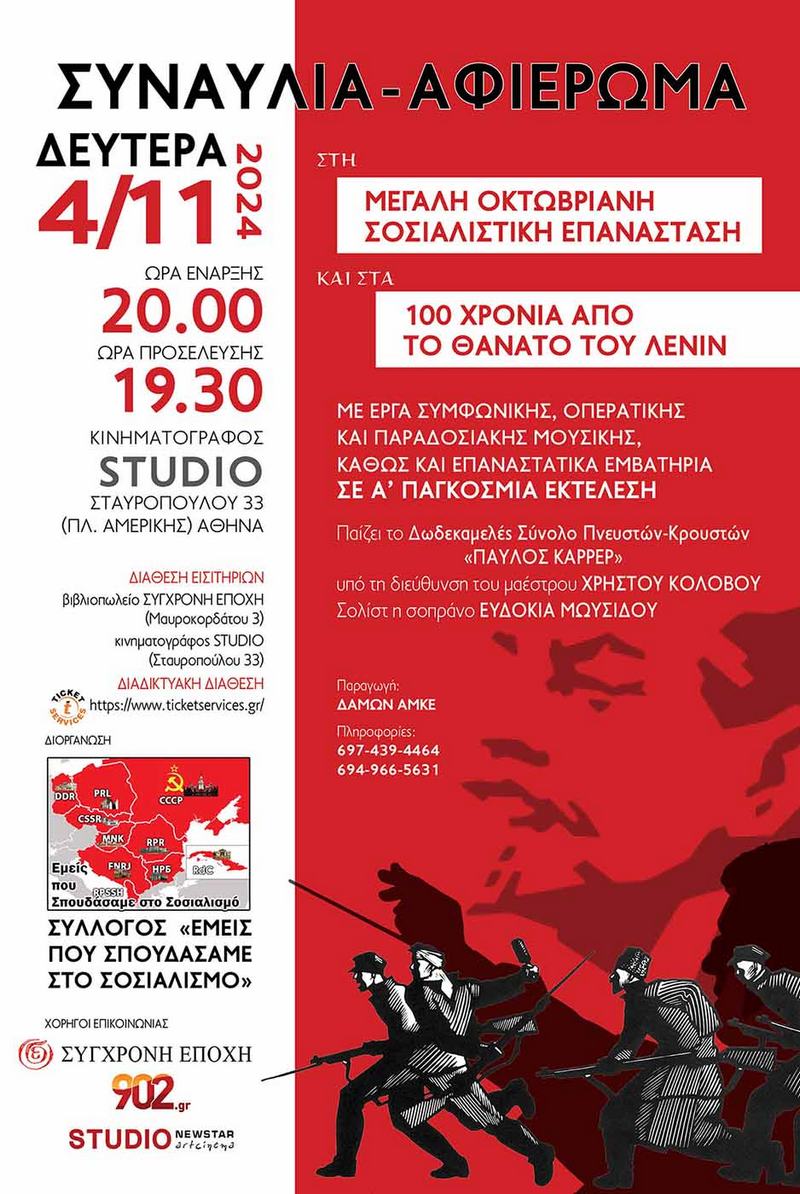 Με αφορμή τα δύο αυτά γεγονότα, ο Σύλλογος «Εμείς που σπουδάσαμε στο Σοσιαλισμό» διοργανώνει συναυλία - αφιέρωμα με έργα συμφωνικής, οπερατικής και παραδοσιακής μουσικής, καθώς και επαναστατικά εμβατήρια, τα περισσότερα εκ των οποίων θα παρουσιαστούν σε Α' Παγκόσμια εκτέλεση!