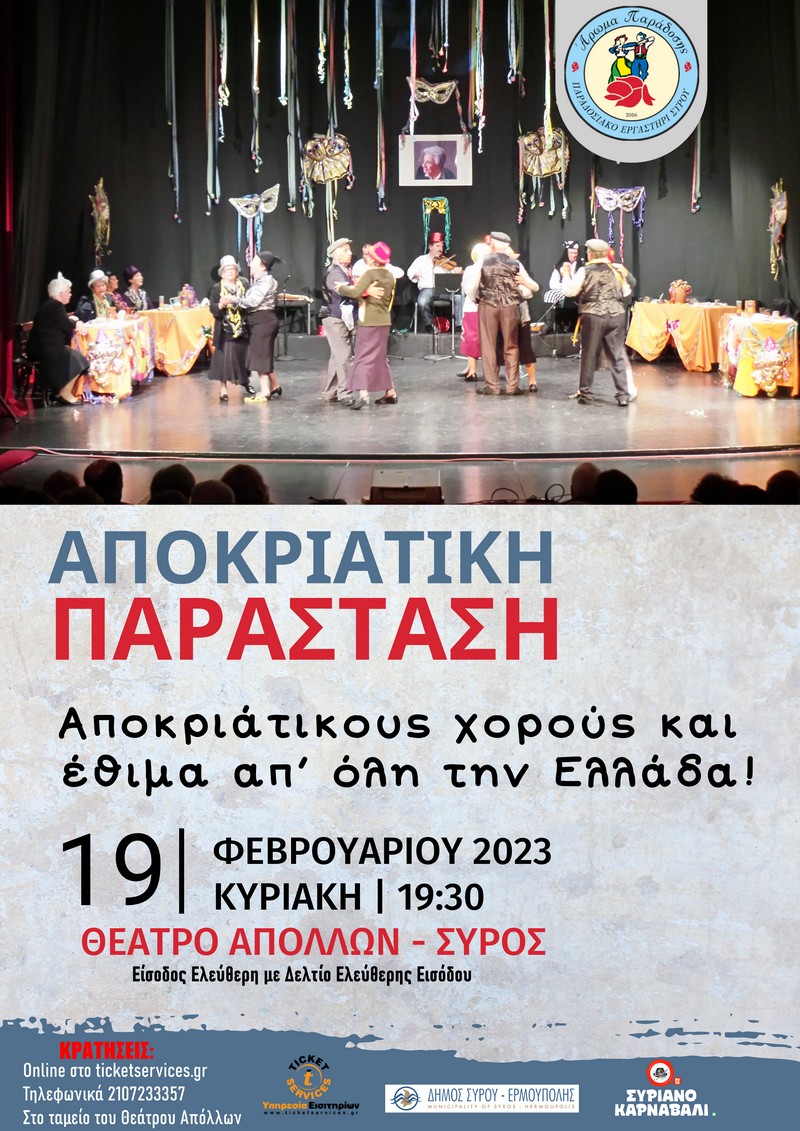 Το παραδοσιακό εργαστήρι Σύρου «Άρωμα Παράδοσης» σε συνεργασία με το τμήμα πολιτισμού του Δήμου Σύρου Ερμούπολης διοργανώνουν την Κυριακή 19 Φεβρουαρίου στις 19:30, στο Θέατρο Απόλλων, Αποκριάτικη παράσταση με αποκριάτικους χορούς και έθιμα απ' όλη την Ελλάδα.
