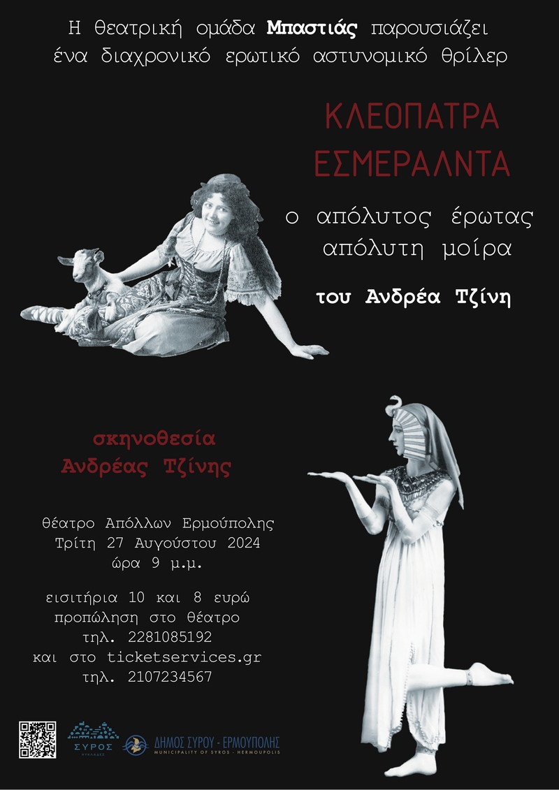 Βρισκόμαστε στο Λονδίνο το1976. Ο ποιοτικός θίασος το “θέατρο του Σύμπαντος” παρουσιάζει στην τελική ανοιχτή για τους θεατές πρόβα και σε κατάμεστο θέατρο, το διαχρονικό ερωτικό αστυνομικό θρίλερ του συγγραφέα Κάσινγκ, που είναι κι ο σκηνοθέτης και ηθοποιός, “Κλεοπάτρα-Εσμεράλντα”: απόλυτος έρωτας απόλυτη μοίρα!”. Ένα έργο σπονδυλωτό, 2 διαφορετικών ιστοριών, τόπων και εποχών, που τις διαπερνά και τις συνέχει ο απόλυτος έρωτας που γεννά η καθεμιά από αυτές τις δύο εκθαμβωτικές καλλονές. Ο συγγραφέας προλογίζει για λίγο κάθε ιστορία.