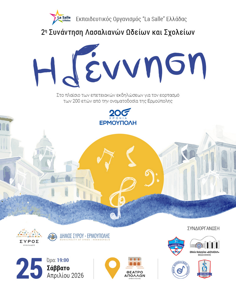 Η Σύρος ετοιμάζεται να υποδεχθεί μια ξεχωριστή γιορτή μουσικής και συνεργασίας. Το ιστορικό Θέατρο Απόλλων φιλοξενεί, στις 25 Απριλίου 2026, τη 2η Συνάντηση Λασαλιανών Ωδείων & Σχολείων, σε μια εκδήλωση που συνδυάζει την καλλιτεχνική δημιουργία με το παιδαγωγικό όραμα του εκπαιδευτικού οργανισμού La Salle Ελλάδας. Η συναυλία, με τον συμβολικό τίτλο «Η Γέννηση», πραγματοποιείται στο πλαίσιο του εορτασμού για τα 200 χρόνια από την ονοματοδοσία της Ερμούπολης. Σπουδαστές, καθηγητές και μουσικά σύνολα από τα Ωδεία των σχολείων «ΔΕΛΑΣΑΛ» Θεσσαλονίκης, Δελασάλ Αλίμου και Ουρσουλινών, ενώνουν τις δυνάμεις τους με τα Εκπαιδευτήρια Δελασάλ Σύρου. Στόχος είναι μια μοναδική μουσική σύμπραξη που θα αναδείξει την ιστορία της πόλης και τους σημαντικούς δημιουργούς που συνδέθηκαν μαζί της. Για τους συμμετέχοντες, η συνάντηση αυτή είναι κάτι πολύ περισσότερο από μια απλή συναυλία. Είναι μια βιωματική εμπειρία συνύπαρξης και ανταλλαγής. Μέσα από κοινές πρόβες και δημιουργική αλληλεπίδραση, οι νεαροί μουσικοί θα έχουν την ευκαιρία να συμπράξουν με συνομηλίκους τους, να καλλιεργήσουν δεξιότητες επικοινωνίας και να βιώσουν στην πράξη τις αξίες της αλληλεγγύης, της ομαδικότητας και του σεβασμού. Το αποτέλεσμα θα αναδείξει τόσο την ατομική προσπάθεια όσο και, κυρίως, τη συλλογική δημιουργία που απαιτεί μια τέτοια μουσική συνάντηση. Η 2η Συνάντηση Ωδείων των λασαλιανών σχολείων δεν φιλοδοξεί να είναι απλώς ένα γεγονός, αλλά ένας θεσμός δημιουργικής σύμπραξης και έμπνευσης. Επιβεβαιώνει το κοινό παιδαγωγικό όραμα των σχολείων και ωδείων του εκπαιδευτικού οργανισμού La Salle Ελλάδας, τα οποία επενδύουν συστηματικά στην καλλιτεχνική παιδεία ως θεμελιώδες στοιχείο για την ολόπλευρη ανάπτυξη των μαθητών και μαθητριών. Η Σύρος, με την πλούσια πολιτιστική ιστορία της και την ιδιαίτερη ταυτότητά της, αποτελεί το ιδανικό σκηνικό για αυτή τη γιορτή.