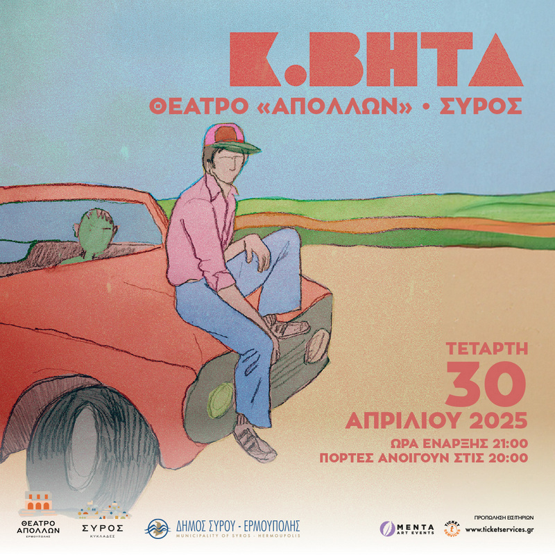 Μετά από τις επιτυχημένες εμφανίσεις στην Αθήνα, ο Κ. Βήτα ταξιδεύει στην Σύρο στο Θέατρο Απόλλων για μία μοναδική συναυλία! σε ένα πρόγραμμα με καινούργια τραγούδια αλλά και επιλογές από όλη την καλλιτεχνική του πορεία. Ο Κ. Βήτα προσκαλεί, την Τετάρτη 30 Απριλίου τους φίλους της μουσικής του να αισθανθούν οικεία μέσα από αυτή την μοναδική συναυλία που είναι σχεδιασμένη ειδικά για το ιστορικό Θέατρο Απόλλων στην Σύρο.