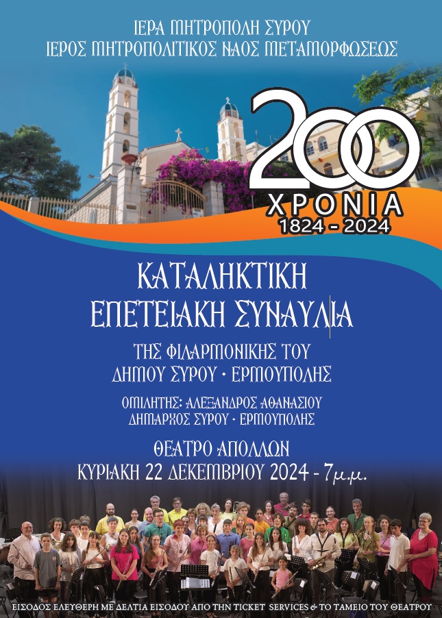 Από την Ιερά Μητρόπολη ανακοινώνεται ότι οι επετειακές Εκδηλώσεις για την συμπλήρωση 200 ετών από της ανεγέρσεως του Ιερού Μητροπολιτικού Ναού της Μεταμορφώσεως του Σωρήρος Ερμουπόλεως, θα επιλεχθούν την Κυριακή, 22 Δεκεμβρίου, στις 7 μ.μ., στο Θέατρο «ΑΠΟΛΛΩΝ», με παρουσιασθεί Συναυλία της Φιλαρμονικής του Δήμου Σύρου-Ερμούπολης και ομιλία του Δημάρχου κ. Αλεξ. Αθανασίου.