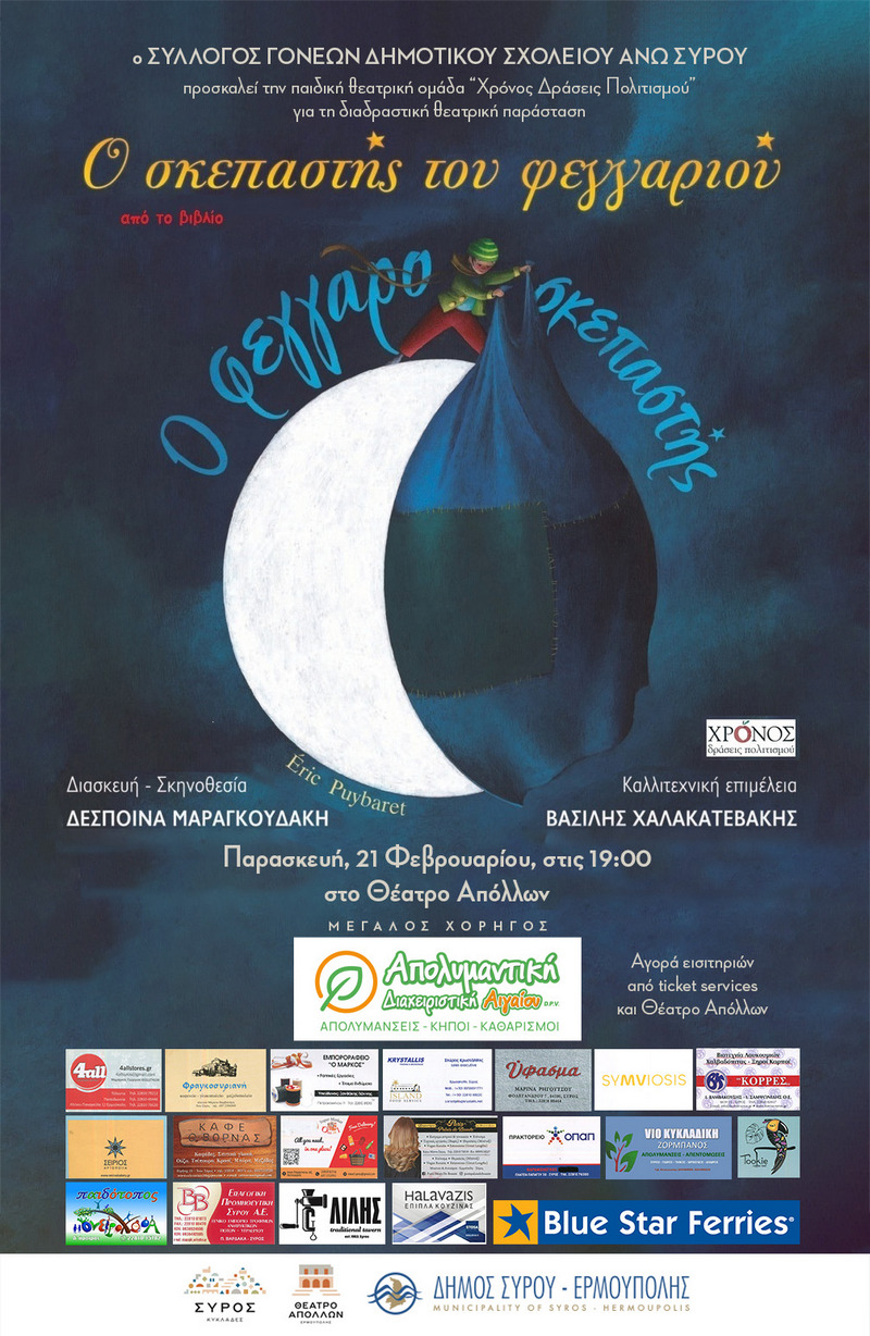 Ο Σύλλογος Γονέων και Κηδεμόνων του Δημοτικού Σχολείου Άνω Σύρου προσκαλεί την Παρασκευή 21 Φεβρουαρίου, στο θέατρο Απόλλων, στη Σύρο, στις 19:00, την ομάδα «Χρόνος Δράσεις Πολιτισμού» για να παρουσιάσει την παράσταση «Ο Σκεπαστής του φεγγαριού», εμπνευσμένη από το βιβλίο του Ερίκ Πυμπαρέ (Eric Puybaret) «Ο Φεγγαροσκεπαστής».