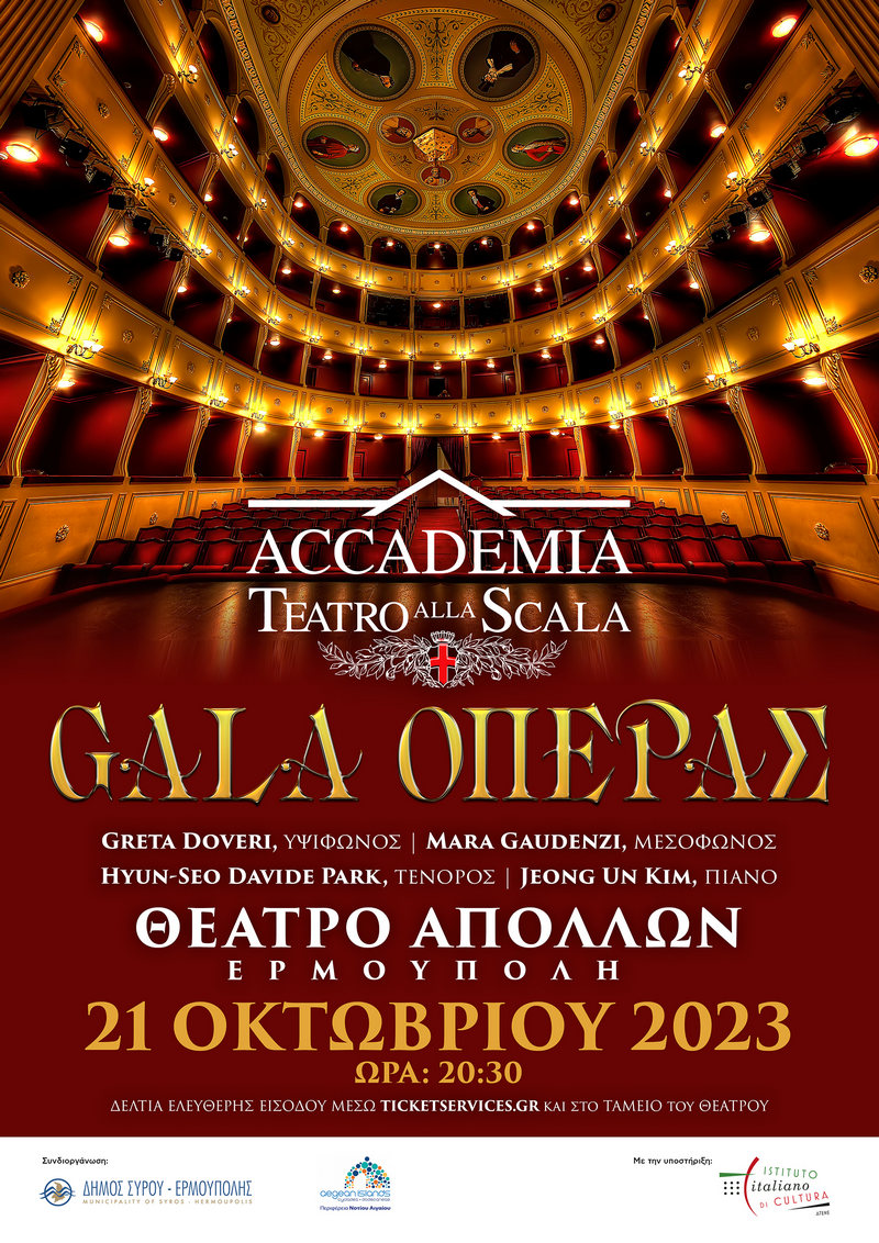 For the second time, the hosting on the stage of the historic Apollo Theater of the top concert of the masters of the "La Scala Academy", on the one hand, seals in the most wonderful way the ties of our iconic theater with the temple of Opera in Europe, taking off the lyrical musical tradition of our island, and on the other hand, the eternal bonds of friendship between Greece and Italy are strengthened.