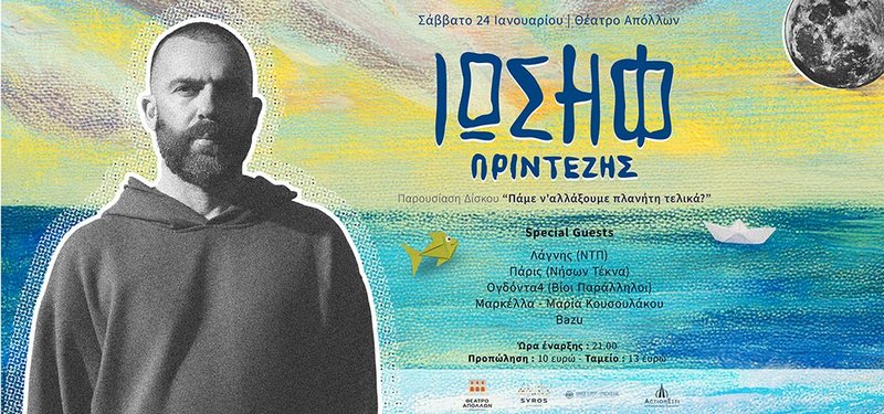 Ο Ιωσήφ Πρίντεζης παρουσιάζει την πρώτη solo δισκογραφική δουλειά του, με τίτλο "Πάμε ν' αλλάξουμε πλανήτη τελικά;", στο Θέατρο Απόλλων στις 24 Ιανουαρίου 2026.