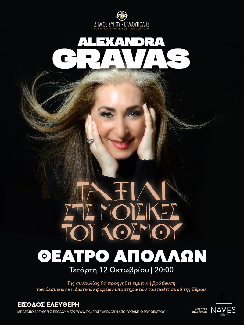 Η σπουδαία ερμηνεύτρια Alexandra Gravas λίγες ημέρες μετά την εμφάνιση της στο Μέγαρο Μουσικής Αθηνών θα μας ταξιδέψει στα πέρατα του κόσμου με τραγούδια από το Μεξικό, Αργεντινή, Ελλάδα, κ.α.