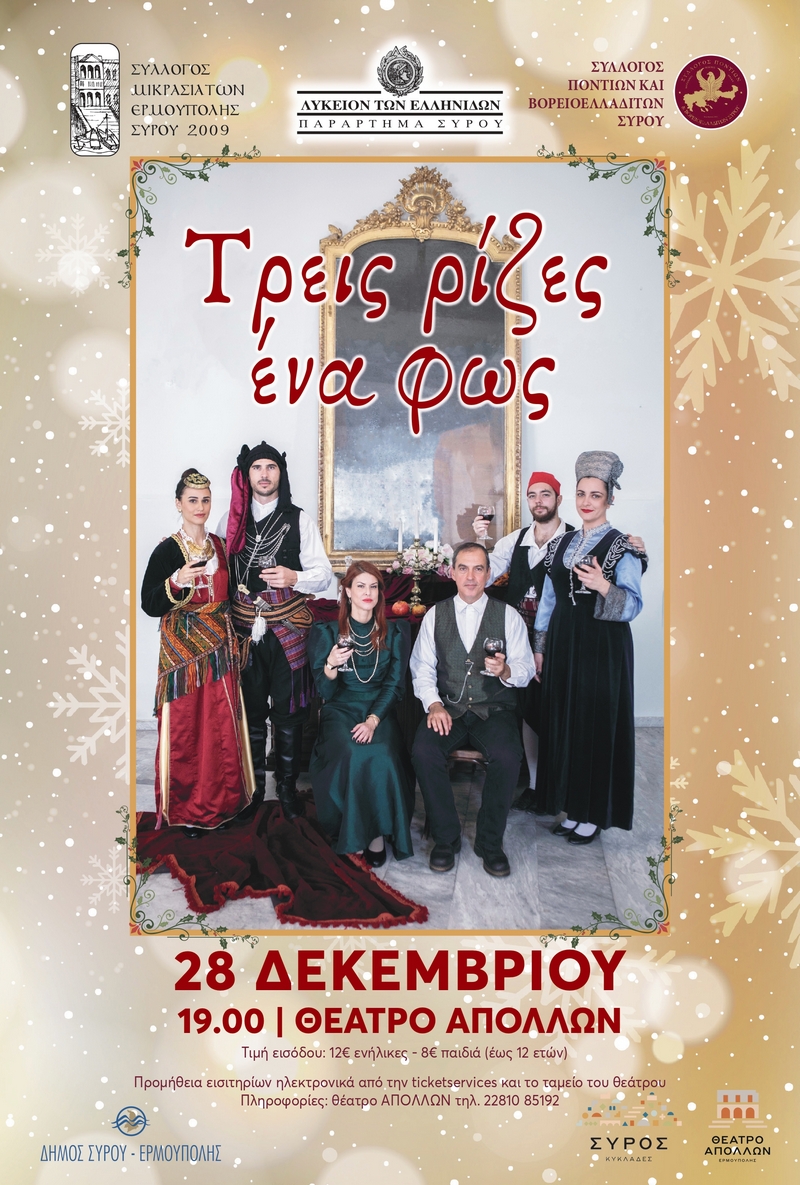 Σε μια ζεστή και συγκινητική θεατρική εκδήλωση, το Λύκειον των Ελληνίδων Σύρου, ο Σύλλογος Μικρασιατών Ερμούπολης και ο Σύλλογος Ποντίων Σύρου ενώνουν τις φωνές, τις μνήμες και τις παραδόσεις τους, φωτίζοντας το πνεύμα των Χριστουγέννων μέσα από το κοινό νήμα της ιστορικής τους πορείας.