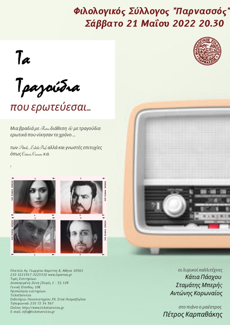Το Σάββατο 21 Μαΐου 2022 στην αίθουσα του Φιλολογικού Συλλόγου Παρνασσός οι λυρικοί καλλιτέχνες, Κάτια Πάσχου, σοπράνο, Σταμάτης Μπερής, τενόρος και Αντώνης Κορωναίος, τενόρος, ερμηνεύουν με τη δική τους υπογραφή αγαπημένες μελωδίες του Αττίκ, Edith Piaf, αλλά και γνωστές επιτυχίες όπως Catari, Caruso. Τραγούδια γνωστά και αγαπημένα «...που ερωτεύεσαι»..και σε κάνουν να ερωτεύεσαι!