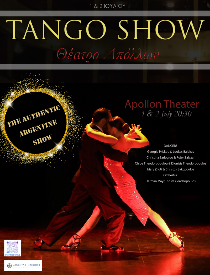 Την μουσικοχορευτική παράσταση ''Tango Show'' στο θέατρο "Απόλλων" (1 και 2 Ιουλίου). Τα 4 χορευτικά ζευγάρια μαζί με το μουσικό ντουετο στροβιλίζονται με δεξιοτεχνία και μας μεταφέρουν στην μεθυστική ατμόσφαιρα του Μπουένος Αιρες.