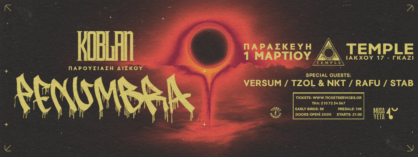 Οι Koblan εμφανίζονται για πρώτη φορά στη σκηνή του Temple για την παρουσίαση του δίσκου τους «Penumbra». Γεμάτοι όρεξη και με πολλές ιδέες οι Koblan ξεκίνησαν πριν από περίπου ένα χρόνο το ταξίδι τους για να δημιουργήσουν κομμάτια που κάνουν το κοινό να φανταστεί, να αισθανθεί, ακόμα και να προβληματιστεί. Ένα ιδιαίτερο project με συμμετέχοντες τους, Abismo, Zastone και DWN, που ένωσαν τις δυνάμεις τους με κοινό γνώμονα την αγάπη τους για το ραπ.