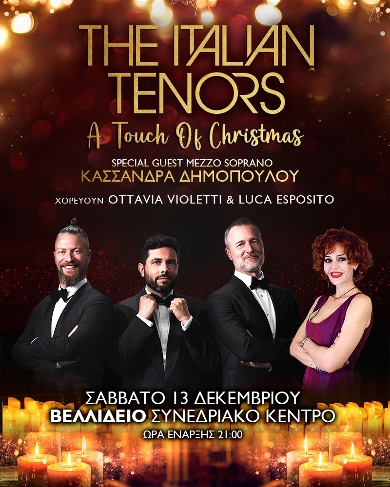Πιστοί στο Xριστουγεννιάτικο τους rendez-vous με το κοινό της Θεσσαλονίκης, οι αγαπημένοι του ελληνικού κοινού The Italian Tenors έρχονται στο Συνεδριακό Κέντρο Ιωάννης Βελλίδης, το Σάββατο 13 Δεκεμβρίου, για μία εμφάνιση με την παράσταση A Touch of Christmas, δίνοντας μια ιδιαίτερη μουσική πινελιά στο εορταστικό πνεύμα των ημερών που έρχονται, της πιο ωραίας εποχής του χρόνου, που είναι τα Χριστούγεννα. Μαζί τους, η εκλεκτή καλεσμένη τους, η γνωστή μεσόφωνος Κασσάνδρα Δημοπούλου.