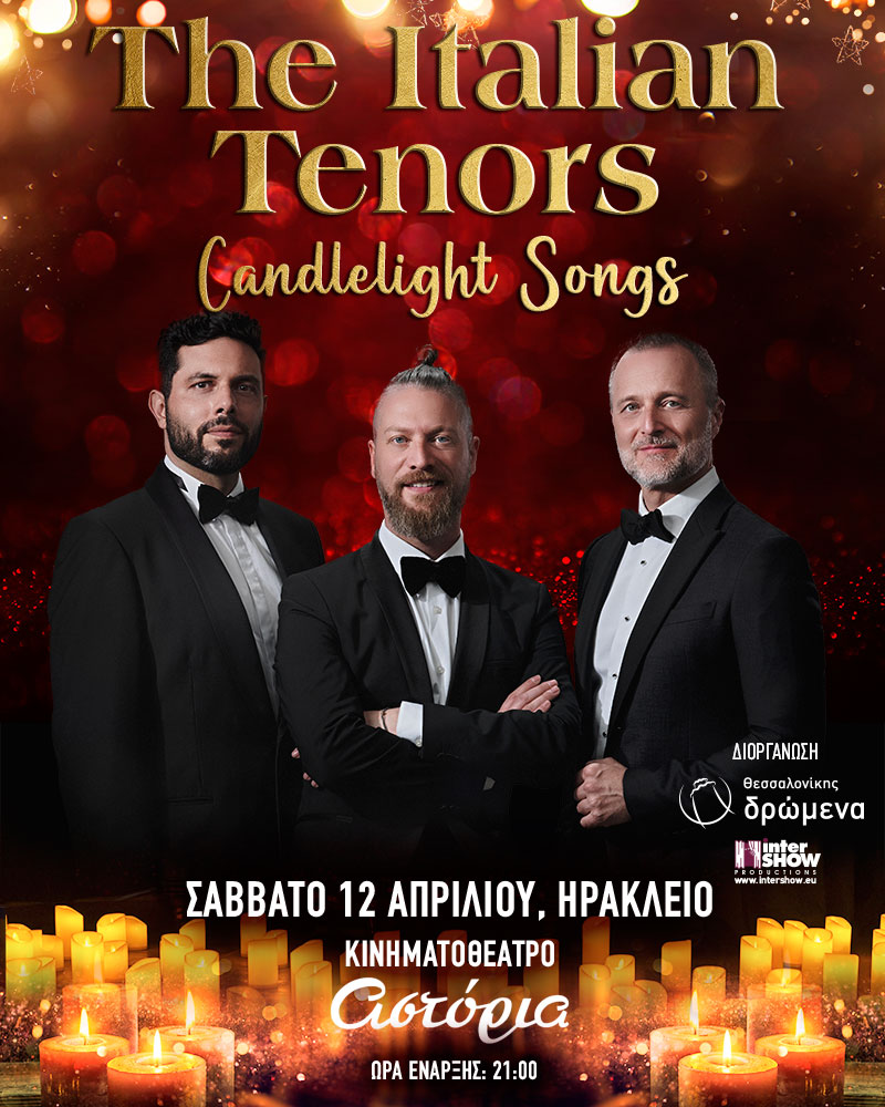 Οι αγαπημένοι του ελληνικού κοινού "The Italian Tenors", έρχονται στο Ηράκλειο για μία μοναδική εμφάνιση με την παράσταση Candlelight Songs, δίνοντας μια ρομαντική μουσική πινελιά Υπό το Φως των Κεριών, στο Κινηματοθέατρο Αστόρια στις 12 Απριλίου.