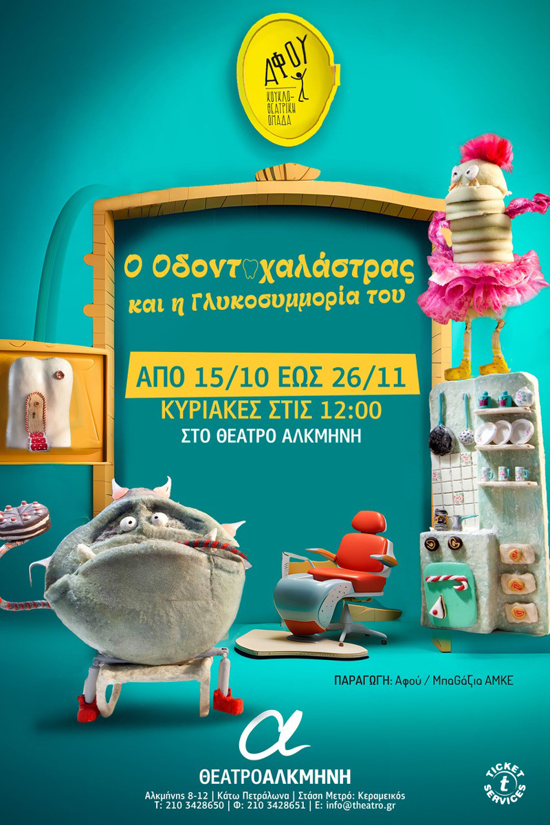 Μετά την επιτυχημένη παρουσίαση της παράστασης «Δαίδαλος και Ίκαρος», η ομάδα ΑΦΟΥ επιστρέφει στο θέατρο Αλκμήνη από την Κυριακή 15 Οκτωβρίου 2023 στις 12.00 για περιορισμένο αριθμό παραστάσεων με την πολυαγαπημένη παράσταση κουκλοθεάτρου «Ο Οδοντοχαλάστρας και η Γλυκοσυμμορία του», χαρίζοντάς μας απλόχερα το γέλιο και τη διασκέδαση μέσα από μια πρωτότυπη και αστεία ιστορία με εντυπωσιακά εναλλασσόμενα σκηνικά, πολλή μουσική και χειροποίητες κούκλες φτιαγμένες με αγάπη και μεράκι.