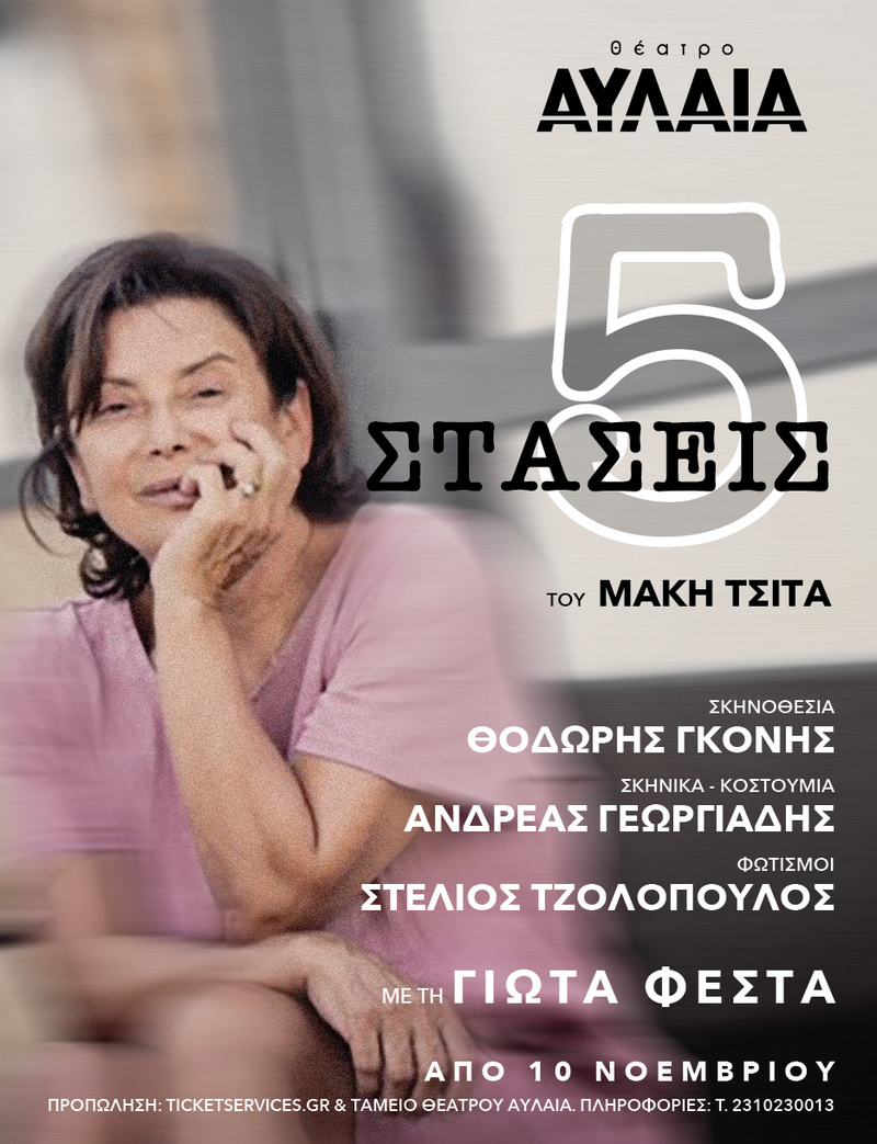 Η νέα παραγωγή του θεάτρου ΑΥΛΑΙΑ με τη Γιώτα Φέστα στις «Πέντε στάσεις» του Μάκη Τσίτα, σε σκηνοθεσία Θοδωρή Γκόνη, έρχεται τον Νοέμβριου του 2023.