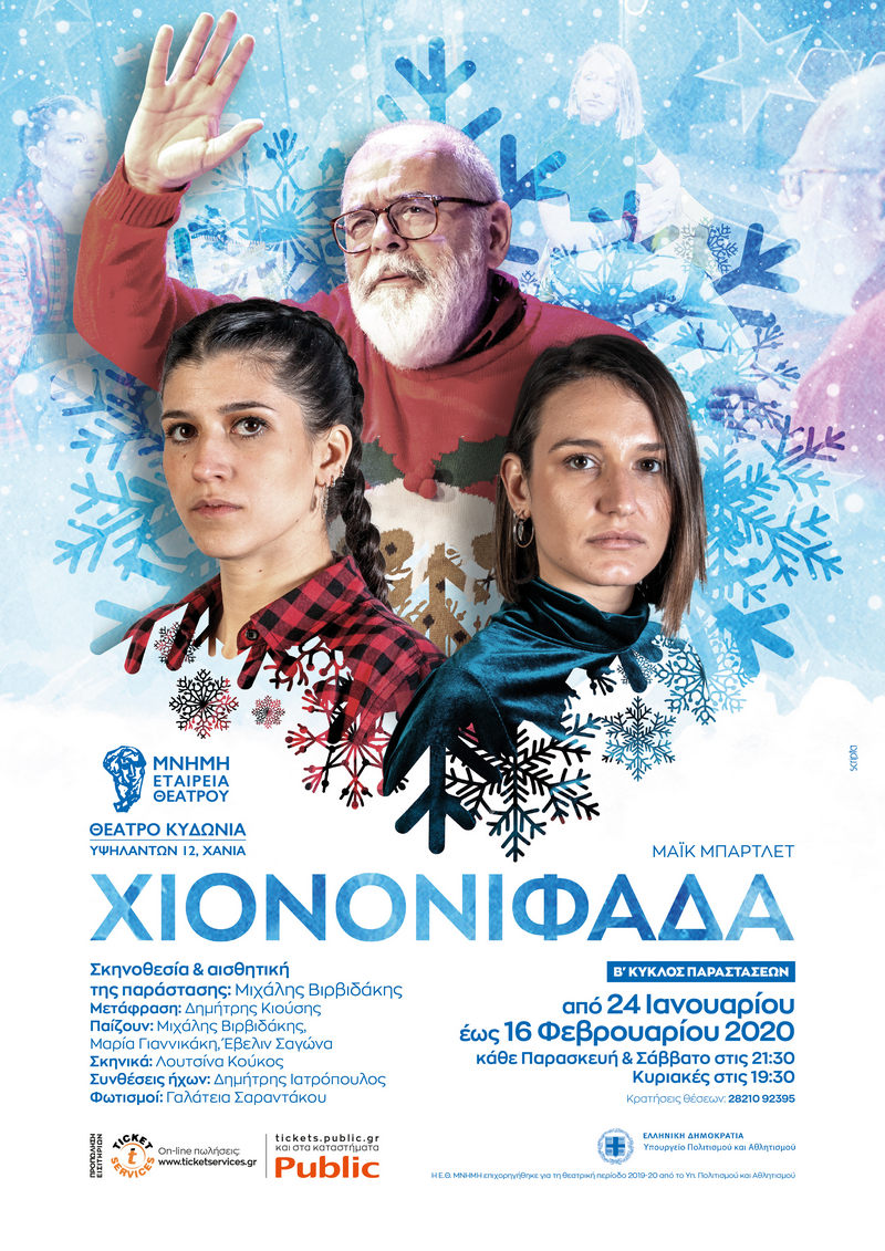 Μετά την μεγάλη επιτυχία που σημείωσε ο πρώτος κύκλος παραστάσεων του έργου «Χιονονιφάδα» του Μάικ Μπάρτλετ η Εταιρεία Θεάτρου ΜΝΗΜΗ ανακοινώνει έναν δεύτερο κύκλο 12 παραστάσεων στο θέατρο Κυδωνία από την Παρασκευή 24 Ιανουαρίου έως και την Κυριακή 16 Φεβρουαρίου κάθε Παρασκευή και Σάββατο στις 9.30 μμ και Κυριακές απογευματινή στις 7.30 μμ.