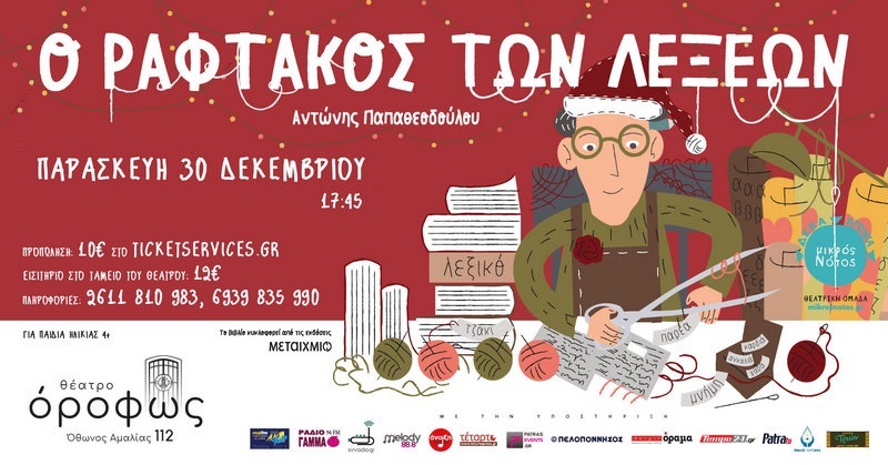 Η θεατρική ομάδα Μικρός Νότος θα ζωντανέψει στη σκηνή το βιβλίο του Αντώνη Παπαθεοδούλου «Ο Ραφτάκος των λέξεων», που κυκλοφορεί από τις εκδόσεις ΜΕΤΑΙΧΜΙΟ, σε θεατρική διασκευή της Τίνας Γιωτοπούλου, σκηνοθεσία του Γιώργου Τζαβάρα, πρωτότυπη μουσική του Νίκου Πλατύραχου και καλλιτεχνική επιμέλεια της Χρύσας Διαμαντοπούλου.