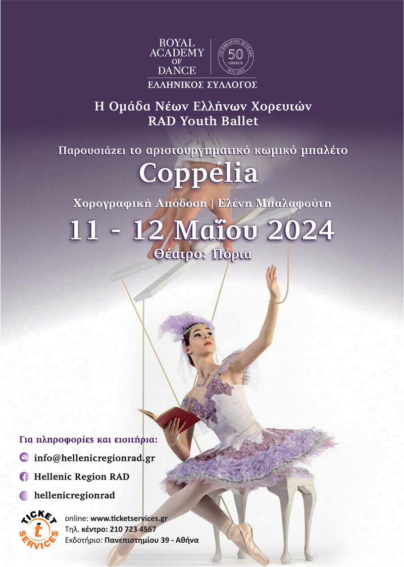 Η Ομάδα Νέων Ελλήνων Χορευτών "RAD Youth Ballet" του Ελληνικού Συλλόγου της Βασιλικής Ακαδημίας Χορού του Λονδίνου θα παρουσιάσει στις 11 και 12 Μαΐου 2024 στο ΘΕΑΤΡΟ ΠΟΡΤΑ το υπέροχο διαχρονικό μπαλέτο COPPÉLIA σε μουσική Léo Delibes. H χορογραφική απόδοση της Ελένης Μπαλαφούτη, που έχει γίνει ειδικά για το RAD Youth Ballet, βασίζεται στην πρωτότυπη χορογραφία των Arthur Saint Leon και Marius Petipa. Στο μπαλέτο χορεύουν οι επαγγελματίες χορευτές Μαρία Κίκινα στον ρόλο της Swanilda, Hλίας Μανιατόπουλος στον ρόλο του Franz, Γιώργος Γαβριήλ στον ρόλο του Dr. Coppélius, και Γωγώ Νικολοπούλουν στον ρόλο της Προσευχής, μαζί με μαθήτριες των ανώτερων τάξεων μπαλέτου των Ερασιτεχνικών Σχολών Χορού των καθηγητών-μελών του Συλλόγου που επιλέχθηκαν μετά από οντισιόν ώστε να παρουσιάσουν την δουλειά τους σε ένα επαγγελματικό πλαίσιο με την σύμπραξη επαγγελματιών χορευτών.