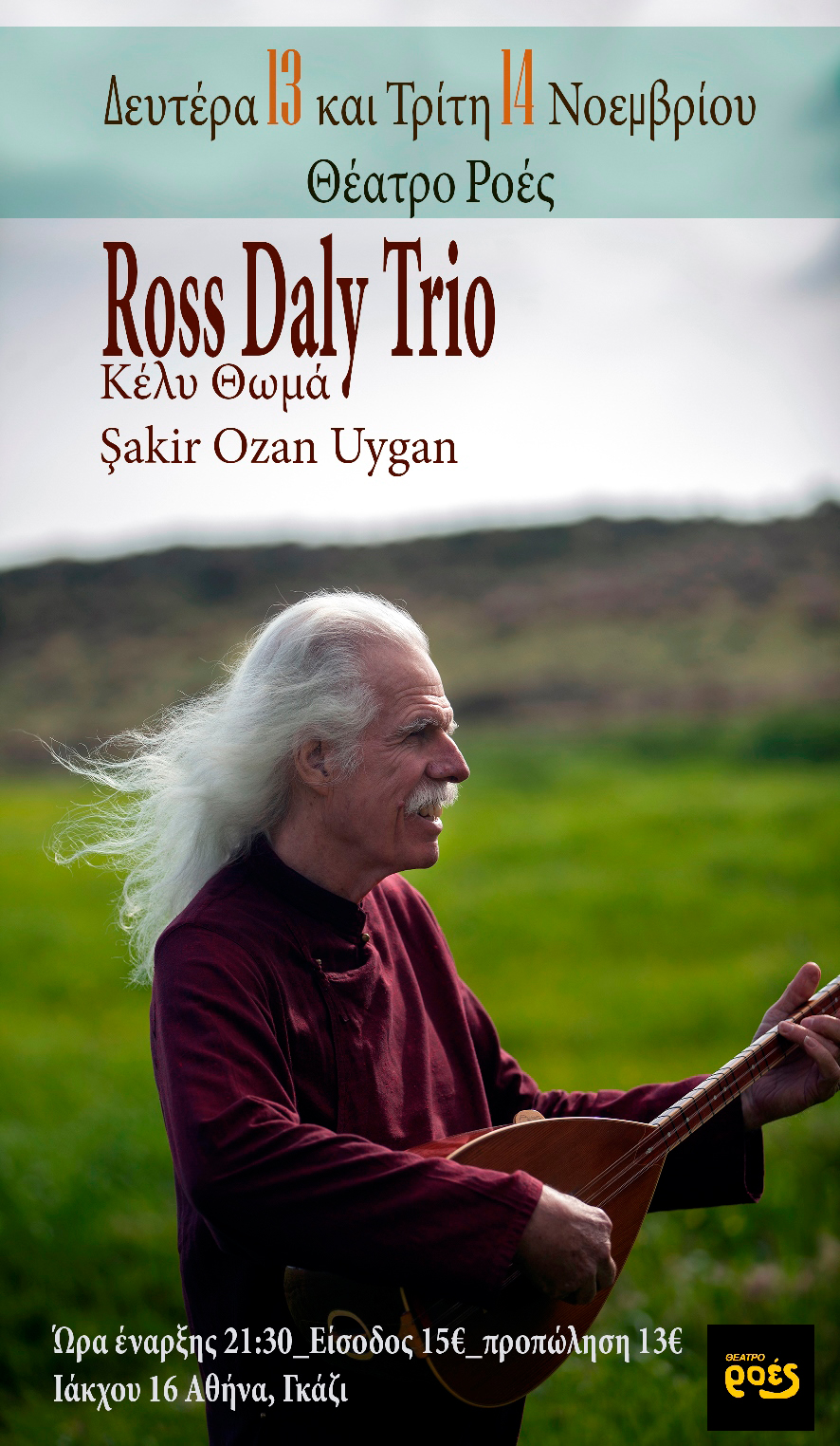 Ο Ross Daly επιστρέφει στο θέατρο Ροές στο Γκάζι την Δευτέρα 13 και την Τρίτη 14 Νοεμβρίου συμπράττοντας με την Κέλυ Θωμά στην λύρα και τον Şakir Ozan Uygan στα κρουστά, δημιουργώντας το Ross Daly Trio!