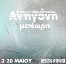Το έργο μετέωρο, εκεί που χτίζεται διαλύεται, ένα γιαπί. Η πόλη μετέωρη, μετά από άγριο πόλεμο, παλεύει να σταθεί. Ο Κρέων θέλει να επιβάλλει δικαιοσύνη, αδέκαστος. Μετά από τη θυσία του παιδιού του βυθίζεται στη μαύρη τρύπα της Άτης, της αδυσώπητης θεάς που σε κάνει να βλέπεις για σωστό το λάθος.