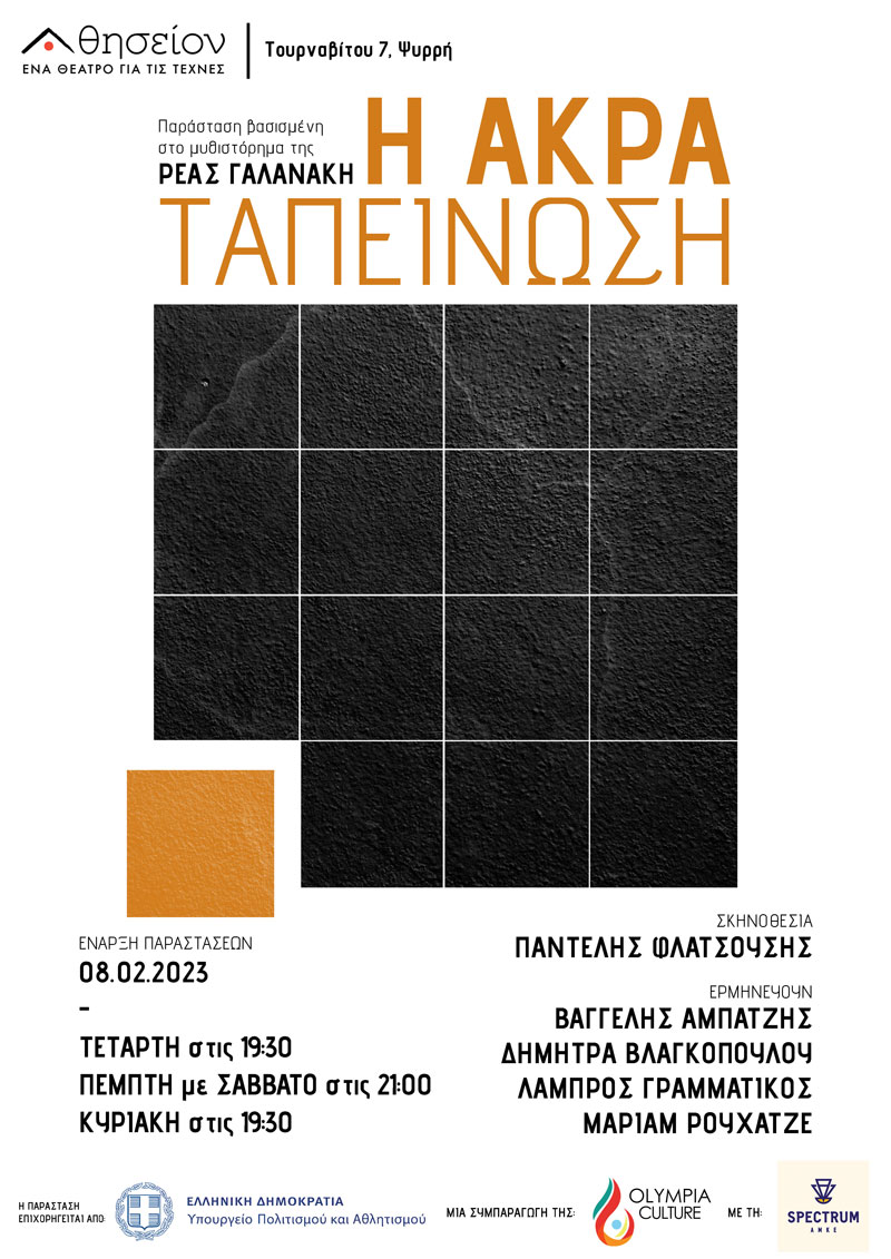 Στην νέα του παράσταση, ο Παντελής Φλατσούσης, (Βραβείο σε Νέο Καλλιτέχνη του Θεάτρου, από την Ένωση Ελλήνων Θεατρικών & Μουσικών Κριτικών, 2022) με μία ξεχωριστή ομάδα ηθοποιών (Δήμητρα Βλαγκοπούλου - βραβείο Μελίνα Μερκούρη 2020, Βαγγέλης Αμπατζής, Λάμπρος Γραμματικός, Μαριάμ Ρουχάτζε), θα επιχειρήσει να δώσει απαντήσεις σε αυτά τα ερωτήματα με αφετηρία και όχημα το ομότιτλο μυθιστόρημα της πολυβραβευμένης Ρέας Γαλανάκη Η Άκρα Ταπείνωση (Καστανιώτης, 2015 - Βalkanika Literary Award, 2019).