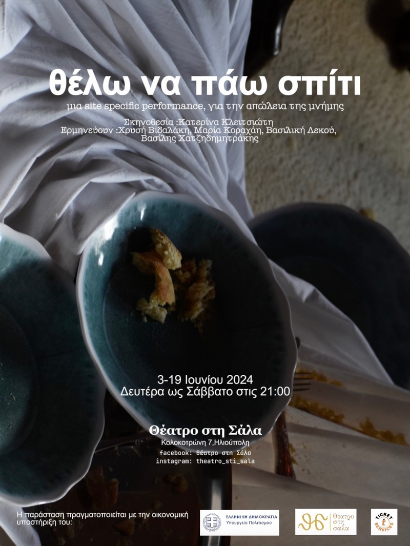 Μια site specific performance με αφετηρία την απώλεια της μνήμης. Το σπίτι που στέγασε μια ολόκληρη ζωή γίνεται τώρα μια άγνωστη χώρα, τα δωμάτια γεμίζουν με ανεξιχνίαστα θραύσματα αναμνήσεων και ανείπωτων λέξεων που μεταμορφώνονται σε μουσική, τραγούδι και ένα ιδιαίτερο οικογενειακό γεύμα. Στην παράσταση οι θεατές κινούνται μαζί με τα πρόσωπα σε ένα αληθινό σπίτι που λειτουργεί και ως θεατρικός χώρος, το Θέατρο στη Σάλα, και βλέπουν όσα συμβαίνουν μέσα από τα μάτια των τεσσάρων μελών της οικογένειας. Μπροστά τους εκτυλίσσεται η γνώριμη χορογραφία της καθημερινότητας σε σκηνοθεσία της Κατερίνας Κλειτσιώτη. Μια ρουτίνα που όμως εδώ αποκτά ζωτική σημασία αφού αποτελεί πάνω από όλα μια απτή υπενθύμιση της πραγματικότητας και του κοινού παρελθόντος.