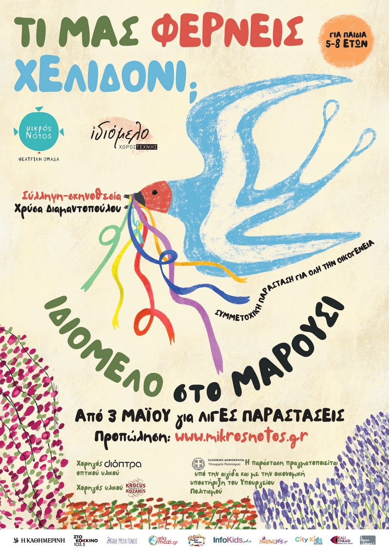 Η νέα συμμετοχική παράσταση της θεατρικής ομάδας Μικρός Νότος, με τίτλο "Τι μας φέρνεις, Χελιδόνι;" απευθύνεται σε παιδιά ηλικίας από 5 ετών και πάνω. Και είναι τα παιδιά που θα προσκαλέσουν τους γονείς τους να μπουν μαζί σε ένα παιχνίδι για να ανακαλύψουν χρώματα, λέξεις, μυρωδιές και εικόνες από την παλέτα των συναισθημάτων. Μέσα από αφηγήσεις και δραματοποιημένες στιγμές της ιστορίας του Ευτυχισμένου Πρίγκιπα, γονείς και παιδιά, θα περάσουν 70 λεπτά πλέκοντας ένα πολύχρωμο γαϊτανάκι από ιστορίες της Άνοιξης, λαϊκές παραδόσεις, αυτοσχεδιασμούς, θεατρικά και παραδοσιακά παιχνίδια, τραγούδια, μουσική, κίνηση, χειροτεχνίες.