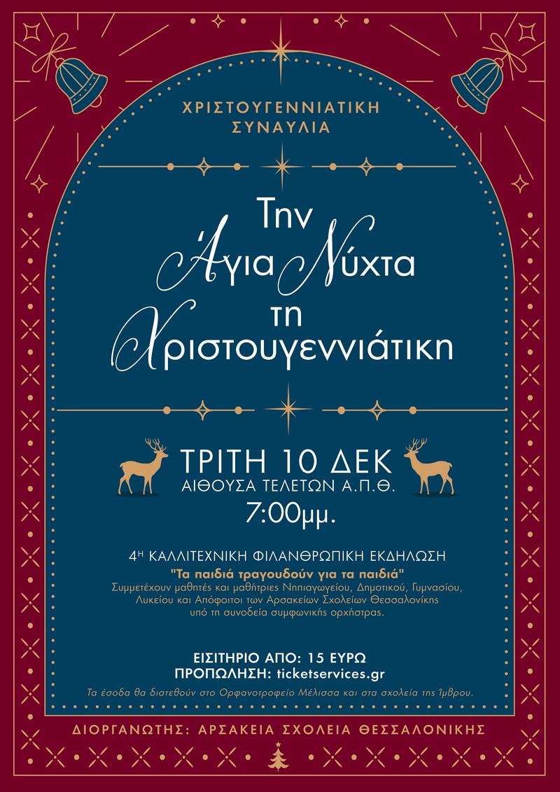Τα Αρσάκεια Σχολεία Θεσσαλονίκης είναι μέλη των σχολείων της Φιλεκπαιδευτικής Εταιρείας, ενός εκπαιδευτικού οργανισμού μη κερδοσκοπικού χαρακτήρα που είναι ο μεγαλύτερος και παλαιότερος της Ελλάδος. Πιστά στο μεγάλο παιδευτικό και κοινωνικό έργο της Φιλεκπαιδευτικής Εταιρείας και με αφορμή το χαρμόσυνο μήνυμα της γέννησης του Θεανθρώπου για ειρήνη και αγάπη στις καρδιές των ανθρώπων, τα Αρσάκεια Σχολεία διοργανώνουν Χριστουγεννιάτικη Φιλανθρωπική Συναυλία με τίτλο: «Την Άγια Νύχτα τη Χριστουγεννιάτικη!»