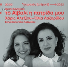 Το Δημοτικό Θέατρο Πειραιά, με αφορμή την επέτειο των 100 χρόνων από τη Μικρασιατική Καταστροφή, παρουσιάζει το κείμενο του Φώτη Κόντογλου «Το Αϊβαλί η Πατρίδα μου», σε μια θεατροποιημένη σκηνική παρουσίαση με τη Χάρις Αλεξίου και την Όλια Λαζαρίδου, στη Κεντρική Σκηνή του Δ.Θ.Π., από την Παρασκευή 9 Σεπτεμβρίου και για λίγες παραστάσεις.