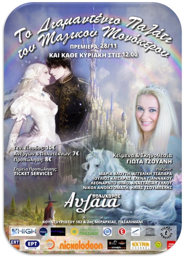 Αυτά όλα θα τα δούμε να διαδραματίζονται στην παιδική Σκηνή του θεάτρου Αυλαία στο Πασαλιμάνι στο "Διαμαντένιο Παλάτι του Μαγικού Μονόκερου" της Γιώτας Τζουάνη.