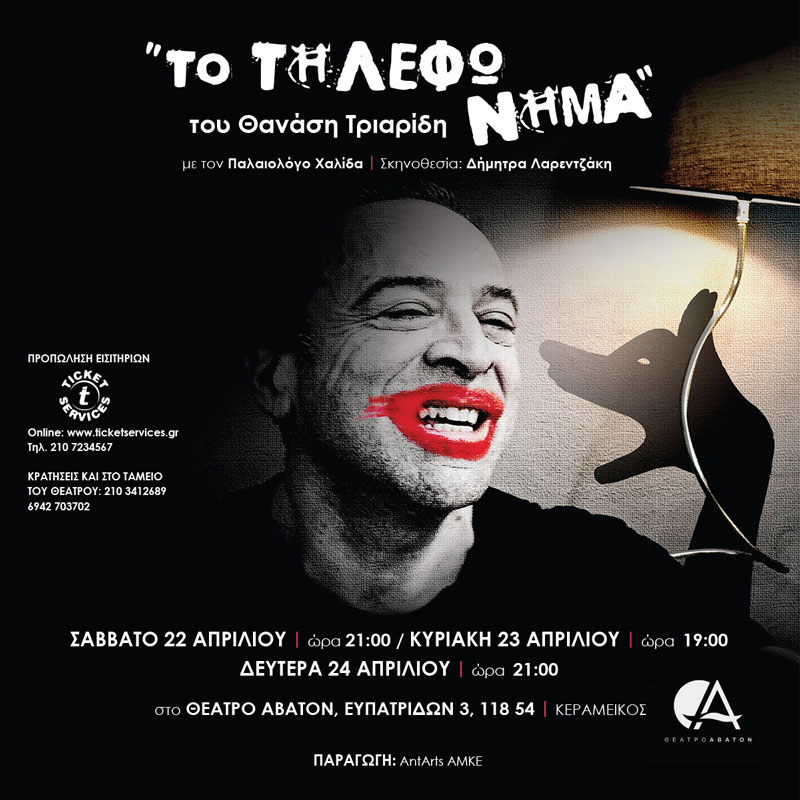 Το τηλεφώνημα του Θανάση Τριαρίδη ανέβηκε σε Πανελλήνια πρώτη με τον Παλαιολόγο Χαλίδα και σε σκηνοθεσία της Δήμητρας Λαρεντζάκη, τον Ιανουάριο στο Θέατρο Act στην Πάτρα, σε παραγωγή της AntArts ΑΜΚΕ. Η παράσταση φιλοξενήθηκε επίσης στην Αθήνα στο Θέατρο Άβατον, στο Θέατρο της Θεατρικής Συμπαιγνίας στα Γιάννενα και στο φεστιβάλ 10ος Μύλος Παραστατικών Τεχνών - Κύκλος στη Λάρισα.