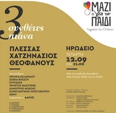 Ο Μίμης Πλέσσας, ο Γιώργος Χατζηνάσιος και ο Γιώργος Θεοφάνους, συναντιούνται στη σκηνή του Ηρωδείου, την Τετάρτη 12 Σεπτεμβρίου στις 21.00 και μας προσκαλούν σε ένα μουσικό ταξίδι με έναν και μόνο σκοπό, τη στήριξη των 40.000 παιδιών που αγκαλιάζει η Ένωση «Μαζί για το Παιδί».